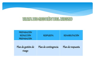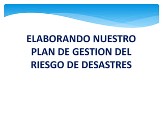El documento presenta los pasos para elaborar un plan de gestión de riesgo de desastres en una institución educativa. Estos incluyen identificar los peligros y vulnerabilidades en la institución y sus alrededores, elaborar un mapa de riesgos, y plantear acciones de prevención, reducción y preparación. El plan final incluye un diagnóstico de riesgo, actividades específicas y anexos de apoyo.