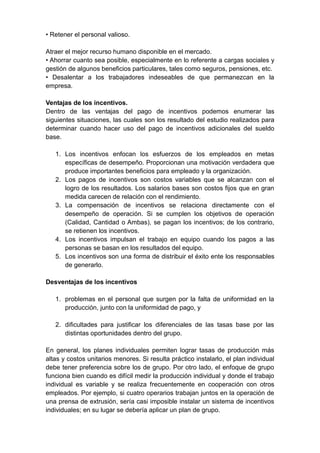El documento explica qué son los incentivos, su origen y objetivos. Los incentivos son pagos como salarios, premios o beneficios que las empresas otorgan a los trabajadores para mejorar su desempeño. Surgen originalmente de las teorías de Frederick Taylor sobre vincular los salarios a la productividad. Los incentivos buscan motivar a los trabajadores a ser más productivos y retener personal valioso. Existen incentivos individuales como comisiones o por piezas producidas, e incentivos grupales que premian el trabajo en equipo.