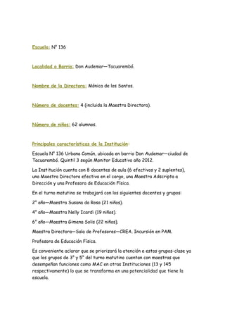 Este documento presenta un plan de intervención para capacitar a maestros en el uso de tecnología educativa en la Escuela N° 136 en Tacuarembó, Uruguay. El plan se centra en capacitar a maestros de 2°, 4° y 6° grado en el uso de plataformas educativas como CREA y PAM, así como en la Biblioteca Digital Ceibal. La intervención se llevará a cabo los miércoles y jueves y tiene como objetivo que los maestros integren más las tecnologías en sus prácticas de enseñ