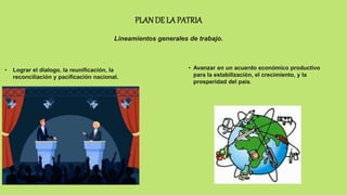 Este documento presenta el Plan de la Patria 2019-2025, cuyos objetivos principales incluyen lograr el diálogo nacional, estabilizar la economía, fortalecer la seguridad social, luchar contra la corrupción, garantizar la educación y salud públicas, lograr la soberanía alimentaria y aplicar el marco constitucional para fomentar la tolerancia. El plan también busca cumplir los objetivos de desarrollo sostenible de la ONU como erradicar la pobreza, el hambre y garantizar la salud y educación para