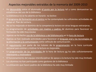 El documento presenta el plan de lectura 2010-2011 de un colegio. Resume los aspectos a mejorar del año anterior como la disminución del gusto por la lectura y el uso limitado de la biblioteca. Propone cinco ámbitos de trabajo como la lectura cooperativa, individual, escritura, uso de recursos multimedia y lenguaje oral. Detalla las actividades por nivel y horario semanal dedicado a fomentar la lectura.