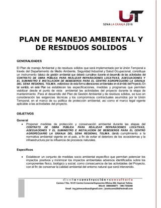 Este documento presenta un plan de manejo ambiental y de residuos sólidos para obras de construcción en el Centro Agropecuario La Granja del SENA Regional Tolima. El plan establece objetivos como proponer medidas de protección ambiental durante las obras y desarrollar procedimientos para implementar dichas medidas con el fin de evitar deterioro ambiental. También incluye recomendaciones para el manejo adecuado de residuos, control de sedimentos y ruido durante la ejecución de las obras.