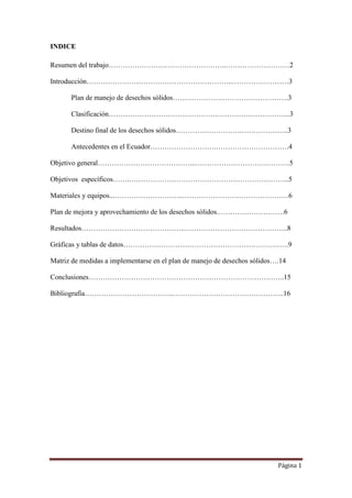 Este documento presenta un plan de manejo de desechos sólidos en el hogar con el objetivo de reducir la cantidad de basura generada y promover el reciclaje. El plan incluye clasificar los desechos en orgánicos, inorgánicos, vidrio y papel, y darles un destino final como plantas de reciclaje o rellenos sanitarios. Además, propone seguir las 4R: reducir, reutilizar, reciclar y recuperar basura. El documento muestra resultados como nuevos objetos hechos de materiales reutil