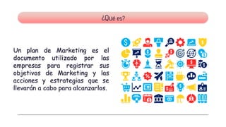 Un plan de marketing documenta los objetivos y estrategias de una empresa para alcanzarlos. Incluye un análisis de la situación actual, objetivos, estrategias, programas de acción, presupuestos y controles. Su propósito es guiar de manera efectiva la implementación de las tácticas de marketing para satisfacer las necesidades de los clientes.
