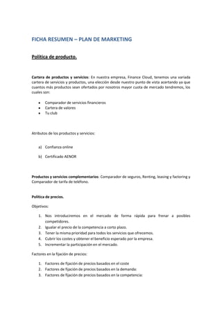 Este documento presenta el plan de marketing de una empresa llamada Finance Cloud que ofrece una variedad de servicios y productos financieros. El plan describe las políticas de producto, precios, distribución, comunicación y promoción. La empresa utilizará una estrategia de penetración de precios para introducirse rápidamente en el mercado y frenar a posibles competidores. La distribución se realizará a través de un canal directo modificado en el que Finance Cloud actúa como intermediario. La comunicación incluirá publicidad en internet, redes sociales y prensa con