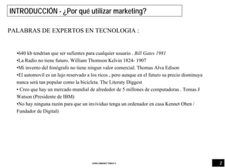 Este documento presenta un plan de marketing. Explica la importancia de realizar análisis interno y externo, incluyendo puntos fuertes, debilidades, oportunidades y amenazas. También describe objetivos y estrategias clave como producto, precio, distribución y comunicación. El objetivo general es definir un enfoque efectivo para satisfacer las necesidades del mercado.