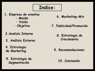 Este documento presenta un plan de marketing para una empresa de eventos. Incluye una sección sobre la misión, visión y objetivos de la empresa, así como un análisis interno y externo. También describe estrategias de segmentación, marketing mix, publicidad y crecimiento de la empresa. Finalmente, ofrece recomendaciones como capacitar al equipo y mantenerse actualizado sobre destinos turísticos para mejorar el servicio al cliente.