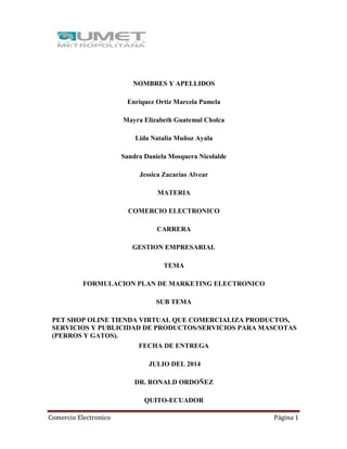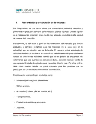 El documento presenta un plan de marketing para una tienda virtual llamada "Pet Shop Online" que vende productos y servicios para mascotas. La tienda ofrecerá una amplia variedad de artículos para perros y gatos, así como servicios de publicidad y consultas médicas básicas gratuitas. El plan de marketing describe cómo el comercio electrónico aumentará la exposición de la tienda y facilitará las compras para los clientes. La tienda operará como una tienda B2C y B2B, atrayendo tanto a consumidores como a otras empresas veterinari