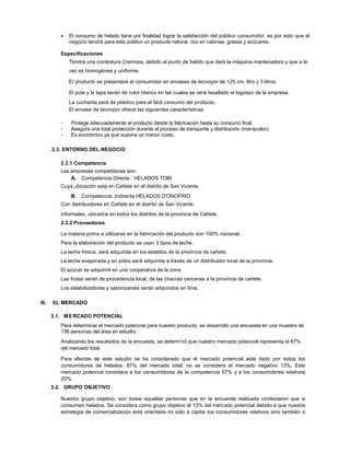 Este documento presenta un plan de marketing para una empresa productora y comercializadora de helados llamada "NIEVE S.R.L." en Cañete, Perú. Incluye un análisis del mercado de helados en la zona, los objetivos de ventas para el primer año, y el mix de marketing propuesto. La empresa competirá principalmente con dos marcas locales de helados y apuntará a captar consumidores entre 5-34 años. El plan proyecta alcanzar ventas del 100% de la producción a través de una fuerza de ventas mixta que