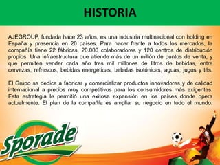 Este documento presenta un análisis de mercado y plan de marketing para la marca Sporade de la compañía AJEGROUP. Incluye un análisis del entorno macro y micro, segmentación del mercado objetivo, posicionamiento de la marca, y estrategias de marketing para las 4P (producto, precio, plaza y promoción). El objetivo es posicionar a Sporade como una bebida rehidratante accesible para hombres y mujeres entre 18-35 años de los niveles socioeconómicos A, B y C.
