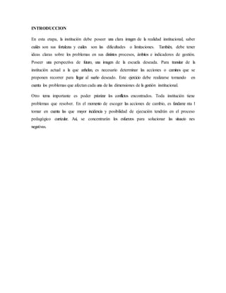 Este documento presenta un informe sobre el diseño curricular de la carrera de Psicología Educativa, Orientación Vocacional y Familiar de la Universidad Nacional de Chimborazo. El informe describe el proceso de planificación del plan de mejoras dentro de las instituciones educativas, incluyendo la identificación de problemas, el establecimiento de metas y acciones, y la evaluación de resultados. El objetivo es analizar cómo se desarrolla el plan de mejoras a través de entrevistas a directores de dos colegios.