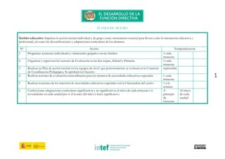 El documento presenta un plan de mejora para un centro educativo con varios ámbitos. Propone acciones para mejorar la orientación educativa y profesional de los alumnos, fomentar el trabajo en equipo del profesorado, hacer de la evaluación un instrumento de motivación, mantener relaciones con otras instituciones, resolver conflictos entre alumnos y fomentar la lectura. Las acciones incluyen reuniones con familias y profesores, elaboración de planes de acción tutorial, evaluaciones de alumnos y docentes, y actividades para promover la colabor