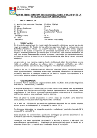El documento presenta el plan de acción de mejora de los aprendizajes del 1er grado "E" de la Institución Educativa General Prado. Los resultados de las pruebas diagnósticas mostraron que la mayoría de estudiantes están en nivel de inicio en matemáticas y comunicación. El plan propone estrategias como elaborar fichas de aprendizaje, aplicar pruebas periódicas y obtener apoyo de los padres, con el objetivo de que todas las estudiantes alcancen el nivel logrado al final del año en ambas áreas.
