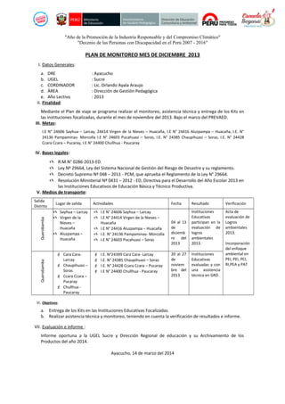 Este documento presenta el plan de monitoreo para el mes de diciembre de 2013 en la región de Ayacucho. El plan tiene como objetivo entregar kits y realizar asistencia técnica en 8 instituciones educativas en los distritos de Querobamba y Soras para evaluar logros ambientales y gestión de riesgos de desastres, de acuerdo con las leyes y normativas nacionales. El coordinador realizará las visitas en diciembre y noviembre, evaluará los resultados e informará a las autoridades educativas regionales.