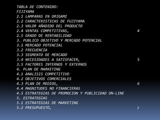 Este documento presenta un plan de negocios para Fujiyama, una empresa que fabricará lámparas de origami. Fujiyama ofrecerá lámparas personalizadas y exclusivas utilizando diseños inspirados en la cultura asiática. El plan describe el producto, público objetivo, estrategias de marketing, requerimientos tecnológicos y proyecciones financieras. El objetivo es posicionar a Fujiyama como una marca innovadora de decoración del hogar y oficina.