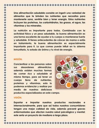 El documento describe los beneficios de una alimentación saludable que incluye una variedad de nutrientes. Una buena nutrición, junto con actividad física y un peso saludable, ayudan al cuerpo a mantenerse fuerte. La buena alimentación es especialmente importante para personas con antecedentes de cáncer de mama o en tratamiento, ya que influye en el sistema inmunológico, estado de ánimo y energía.