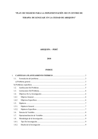 Este documento presenta un plan de negocios para implementar un centro de terapia de lenguaje en Arequipa, Perú. Se identifica la necesidad de este servicio debido al número significativo de personas con trastornos del lenguaje y la falta de suficientes centros de terapia. El objetivo general es evaluar la viabilidad operativa y económica del proyecto. Se realizará un estudio de mercado, un análisis del entorno, y se definirán los procesos y la viabilidad financiera del centro de terapia de len