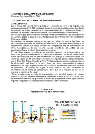 Este documento presenta un plan de negocios para exportar carne de cuy congelada a los Estados Unidos. Actualmente, el mercado peruano de cuy no satisface la demanda y la producción es limitada y de baja calidad. Exportar carne de cuy congelada a EE.UU. aprovecharía la creciente demanda de las comunidades latinoamericanas y permitiría aumentar la producción y mejorar la calidad para satisfacer la demanda interna y externa. Se analiza la demanda actual y potencial en Perú y EE.UU., concl