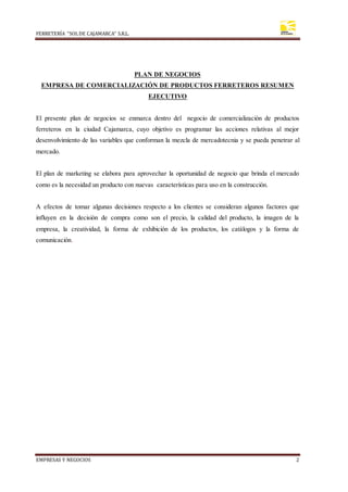 Este documento presenta un plan de negocios para una ferretería llamada "Solde Cajamarca S.R.L." en Cajamarca, Perú. Incluye un análisis del entorno legal, económico y tecnológico, así como de la competencia actual y potencial. También presenta un estudio de mercado con objetivos, fuentes de información, metodología y análisis, incluyendo estimaciones de demanda. El plan busca programar las acciones de marketing para penetrar el mercado local de productos ferreteros aprove
