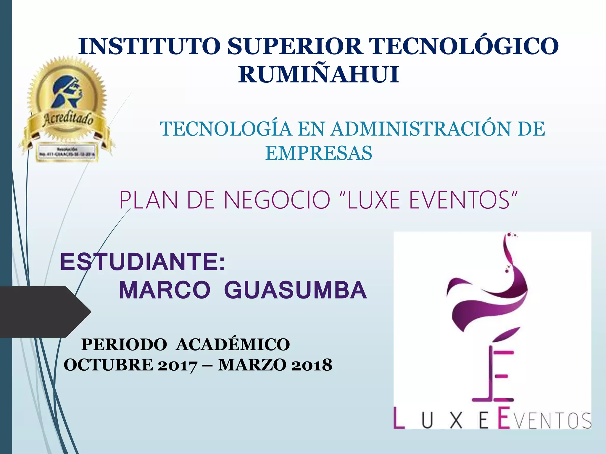 Luxe Eventos es una empresa que ofrece servicios de planificación y organización de eventos sociales. La empresa fue fundada en 2014 y actualmente cuenta con 4 empleados. El documento describe la misión, visión, valores y estructura organizacional de la empresa, así como su plan de marketing y administración de personal y salarios. El objetivo es posicionarse como líder en la planificación de eventos sociales en la región de Valle de los Chillos para 2020.