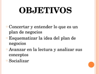 El documento presenta información sobre los conceptos clave de un plan de negocios. Explica que es importante entender las necesidades de los consumidores y desarrollar productos que las satisfagan. También destaca la importancia de tener ventajas competitivas únicas, realizar investigación y desarrollo continuos, proteger la propiedad intelectual, analizar la demanda y competencia en el mercado, y realizar investigación de mercados para respaldar las decisiones empresariales.