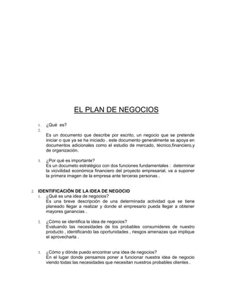Este documento presenta un plan de negocios para un restaurante de comida marina llamado "Cebichería Sara Sara" en el distrito de Bellavista en Lima, Perú. El plan describe la idea del negocio, la estructura organizacional, los productos que ofrecerán como ceviche mixto y arroz con mariscos, detalles sobre promociones y atención al cliente, y la ubicación y trabajadores del restaurante.