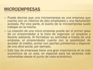 Este documento describe las características de diferentes tipos de empresas como microempresas, pequeñas empresas y empresas medianas. Explica que una microempresa tiene un máximo de 10 empleados y facturación limitada, mientras que una pequeña empresa no domina su industria y tiene ventas anuales y empleados por debajo de ciertos umbrales. Una empresa mediana tiene entre 50 y 500 empleados. El documento también destaca la importancia de tener un plan de negocios para definir claramente los objetivos y estrategias de una empresa y mejorar sus posibilidades de é