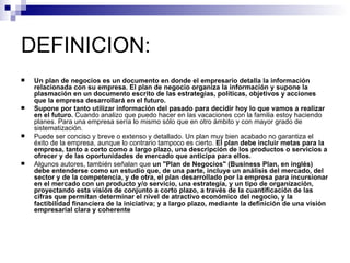 El documento describe los componentes clave de un plan de negocios. Explica que un plan de negocios es un documento que detalla la información relacionada con una empresa, incluyendo estrategias, objetivos, análisis de mercado y proyecciones financieras. También destaca la importancia de la organización empresarial, contabilidad y finanzas al elaborar un plan de negocios efectivo.