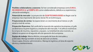 OLMTECHNOLOGIES es una empresa ubicada en Villavicencio, Meta, Colombia que se dedica al suministro y mantenimiento de equipos y partes tecnológicas a la comunidad de la Orinoquia. La empresa busca establecer alianzas con importadores y marcas reconocidas y considera como posibles colaboradores a empresas con experiencia en la región. Su objetivo es convertirse en la empresa líder del sector de tecnologías de la información en la Orinoquia y proyecta un crecimiento anual de ventas del 5%.