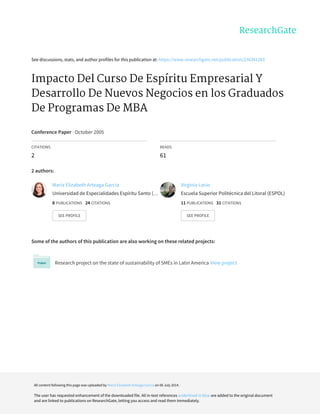 Este documento presenta los resultados de una evaluación del impacto de un curso de espíritu empresarial en graduados de programas de MBA. El curso se enfoca en desarrollar habilidades emprendedoras como la elaboración de planes de negocio. La evaluación analiza cuatro áreas: 1) nuevos negocios creados a partir de los planes de negocio, 2) intención de iniciar un nuevo negocio, 3) intraemprendimiento y 4) desarrollo de habilidades emprendedoras. Se realizaron análisis comparat