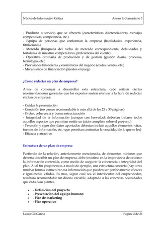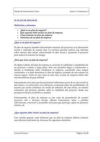 El documento habla sobre los planes de negocio. Explica que un plan de negocio es una herramienta escrita que permite evaluar la viabilidad de una idea de negocio y reducir riesgos. Luego, detalla los aspectos clave que debe incluir un plan de negocio como el producto/servicio, equipo, mercado, operaciones, finanzas y aspectos legales. Finalmente, ofrece una estructura de referencia para organizar la información en un plan de negocio.