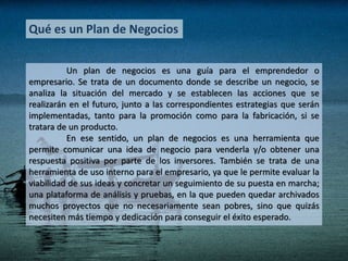 Un plan de negocios permite al promotor realizar un estudio de mercado para determinar la viabilidad de su proyecto y posicionarlo correctamente, además de darle una comprensión completa del funcionamiento del negocio. Las proyecciones financieras, una vez evaluadas, permiten valorar la capacidad del proyecto de generar rendimientos adecuados para compensar la inversión requerida. Un plan de negocios también ayuda a identificar los recursos y acciones necesarios para alcanzar los objetivos organizacionales.