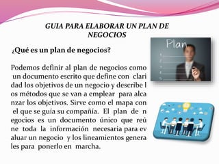 El documento define un plan de negocios como un documento escrito que establece los objetivos y métodos de un negocio. Un plan de negocios ayuda a clarificar las metas, coordinar los factores necesarios para el éxito de un negocio, y obtener apoyo de inversionistas. Los planes pueden ser resumidos, completos u operativos, dependiendo del alcance y tamaño del negocio.