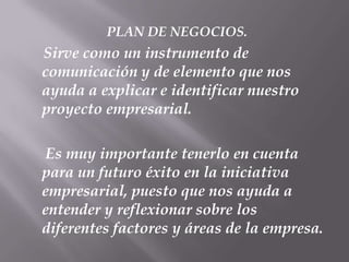 El documento presenta un plan de negocios para una empresa de servicios turísticos llamada FiestaVentura que ofrece actividades de campamento para niños y jóvenes. Explica que un buen plan de negocios es una herramienta de comunicación importante y detalla los pasos clave que incluye, como un resumen ejecutivo, análisis del mercado, planes de marketing, operaciones y finanzas. Luego describe la idea de negocio de FiestaVentura, su ventaja competitiva y objetivo de mercado.