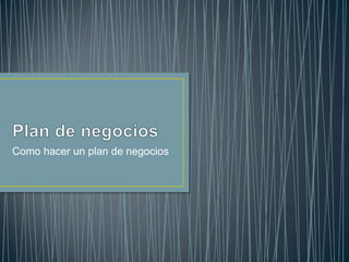 Este documento proporciona orientación sobre cómo hacer un plan de negocios efectivo. Debe incluir una descripción de la empresa, el análisis del mercado, los productos o servicios y la estrategia de comercialización. También debe detallar los presupuestos financieros y mostrar que el equipo gerencial tiene la experiencia necesaria para hacer que el negocio tenga éxito.