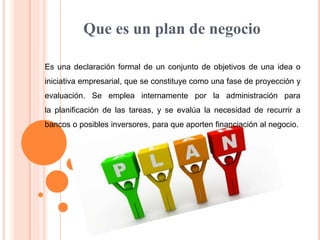 Este documento resume los conceptos clave de un plan de negocio. Explica que un plan de negocio es una declaración formal de los objetivos y estrategia de un negocio que se usa para la planificación interna y para obtener financiamiento. También describe los pasos para crear un plan de negocio efectivo y las ventajas de tener un plan de negocio bien desarrollado, como obtener financiamiento bancario y captar socios e inversores.