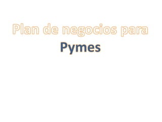 Este documento presenta una guía sobre el contenido de un plan de negocios para pymes. Explica que un plan de negocios describe un negocio de manera detallada para eliminar la improvisación y asegurar su éxito. Detalla las secciones clave que debe contener como descripción del negocio, estrategia, investigación de mercados, operaciones, organización y finanzas.