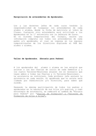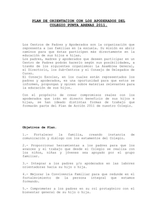 El documento presenta el Plan de Orientación con los Apoderados del Colegio Punta Arenas para el año 2011. El plan incluye objetivos como fortalecer la comunicación entre la familia y la escuela, proporcionar herramientas a los padres para apoyar el aprendizaje de sus hijos, e integrar a los padres en las labores de orientación. El plan también describe las charlas y talleres que se llevarán a cabo durante el año para abordar temas como la convivencia escolar y familiar.