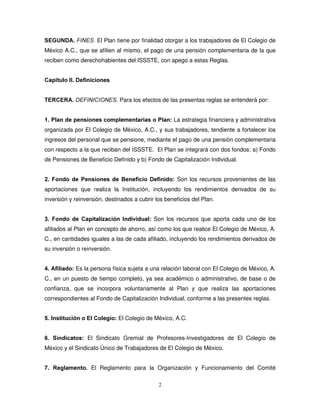 Este documento establece las reglas para la operación de un plan de pensiones complementarias para el personal de El Colegio de México. El plan tiene como objetivo otorgar una pensión adicional a la que reciben los trabajadores a través del ISSSTE. El plan se financiará a través de fondos de pensiones de beneficio definido y de capitalización individual. Los trabajadores podrán jubilarse de forma anticipada a los 55 años o normal a los 60 años y tendrán derecho a recibir una pensión complementaria del 1.5% de su salario por cada