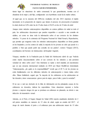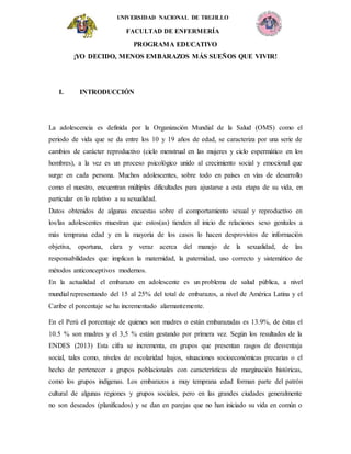 Este documento presenta el programa "¡Yo decido, menos embarazos más sueños que vivir!" diseñado por estudiantes de enfermería de la Universidad Nacional de Trujillo para concientizar sobre la prevención de embarazos en adolescentes. El programa se llevará a cabo en la I.E "Abelardo Gamarra Rondo" en Curgos durante noviembre y diciembre de 2019, y tiene como objetivos concientizar a estudiantes sobre la importancia de una educación sexual saludable, el uso de anticonceptivos y la comunicación entre