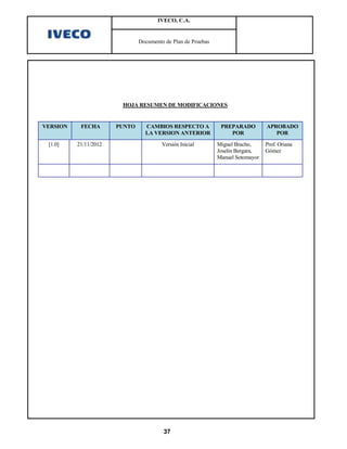 Este documento presenta el plan de pruebas para un sistema de alertas y monitoreo de servicios dirigido al Departamento de Sistemas de IVECO, C.A. El plan describe los objetivos, alcances y entorno de las pruebas. Las pruebas se realizarán en dos módulos: registro y monitoreo de dispositivos y servicios. El plan incluye cuadros con los casos de prueba para cada componente, así como los criterios de aprobación. El objetivo es verificar que el sistema cumpla los requerimientos funcionales y operat