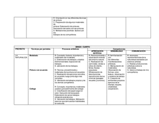 Este documento presenta los proyectos y técnicas artísticas que se enseñarán en los grados 3ro al 5to, incluyendo modelado, dibujo, collage, pintura, origami, construcción y más. Cada técnica describe los conceptos clave, materiales, procedimientos, competencias y sensibilidades que los estudiantes desarrollarán. Los proyectos se centran en temas como la identidad personal, la comunidad y la naturaleza. El objetivo general es que los estudiantes exploren sus habilidades creativas y apreci