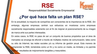 Este documento presenta un plan de responsabilidad social empresarial (RSE) para la empresa Alimentos Kowi S.A. de C.V. El plan describe por qué es importante implementar principios de RSE, incluyendo mejorar el uso de recursos, fomentar la innovación a través de la participación de las partes interesadas, y aumentar la satisfacción de los clientes mediante el bienestar de los empleados. También presenta objetivos, áreas de impacto, y un método de implantación en cuatro fases con seguimiento continuo.