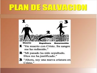 El documento presenta el plan de salvación según la Biblia. Explica que Jesús vino para salvar a la gente de sus pecados y que para recibir esta salvación, las personas deben oír el evangelio, creer en Jesús como el Hijo de Dios, arrepentirse de sus pecados, confesar públicamente su fe y ser bautizadas. Siguiendo estos pasos, las personas reciben el perdón de pecados y la vida eterna.