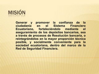 El documento presenta la visión, misión, objetivos y procesos de una organización encargada de garantizar los depósitos bancarios de los clientes. Su visión es cumplir con los pagos de forma eficiente y oportuna aplicando las técnicas más convenientes. Su misión es generar confianza en el sistema financiero a través del aseguramiento de depósitos. Sus objetivos incluyen proteger los recursos de los depositantes y diseñar plataformas tecnológicas para sus procesos críticos.