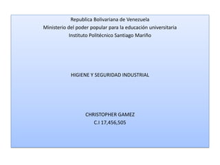 El documento es un certificado de estudios de higiene y seguridad industrial emitido por el Instituto Politécnico Santiago Mariño en Venezuela a favor de Christopher Gamez, con cédula de identidad 17,456,505.