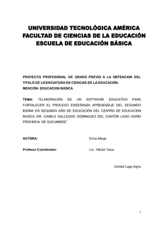 Este documento presenta un proyecto de tesis para obtener el título de Licenciatura en Ciencias de la Educación, con mención en Educación Básica. El proyecto propone elaborar un software educativo para fortalecer la enseñanza del inglés en segundo año de educación básica en un centro educativo, debido a que actualmente los docentes carecen de materiales adecuados. El documento incluye la justificación, objetivos, marco teórico, metodología, población y muestra, cronograma y bibli