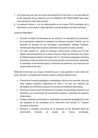 El documento trata sobre la capacitación docente para la implementación de las TIC en el aula. Propone convertir las salas de informática en laboratorios de construcción de conocimientos mediante software educativo, permitiendo a los docentes desarrollar proyectos colaborativos utilizando tecnologías. También busca reevaluar los procesos de enseñanza considerando los cambios en la estructura mental de los estudiantes y actualizar las teorías educativas a la luz de las nuevas tecnologías.