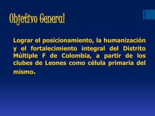La candidata a la presidencia del Consejo de Gobernadores propone lograr el posicionamiento, la humanización y el fortalecimiento integral del Distrito Múltiple F de Colombia a través de los clubes de Leones. Sus objetivos incluyen cumplir con las funciones estatutarias, impulsar el Plan de Acción Nacional 2014-2017, desarrollar programas de protección ambiental y paz en Colombia, y fortalecer los valores entre los socios.