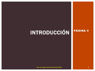 Este documento presenta el plan de trabajo de una congregación religiosa de octubre de 2011 a julio de 2012. El plan propone dos prioridades: 1) la primacía de la persona a través del cuidado espiritual de las hermanas y 2) la creación de demarcaciones abiertas o zonas de misión dependientes del gobierno general para facilitar la unificación y comunión en la misión. El plan también incluye consideraciones sobre la planificación a corto, medio y largo plazo para guiar el trabajo de la congregación durante ese período